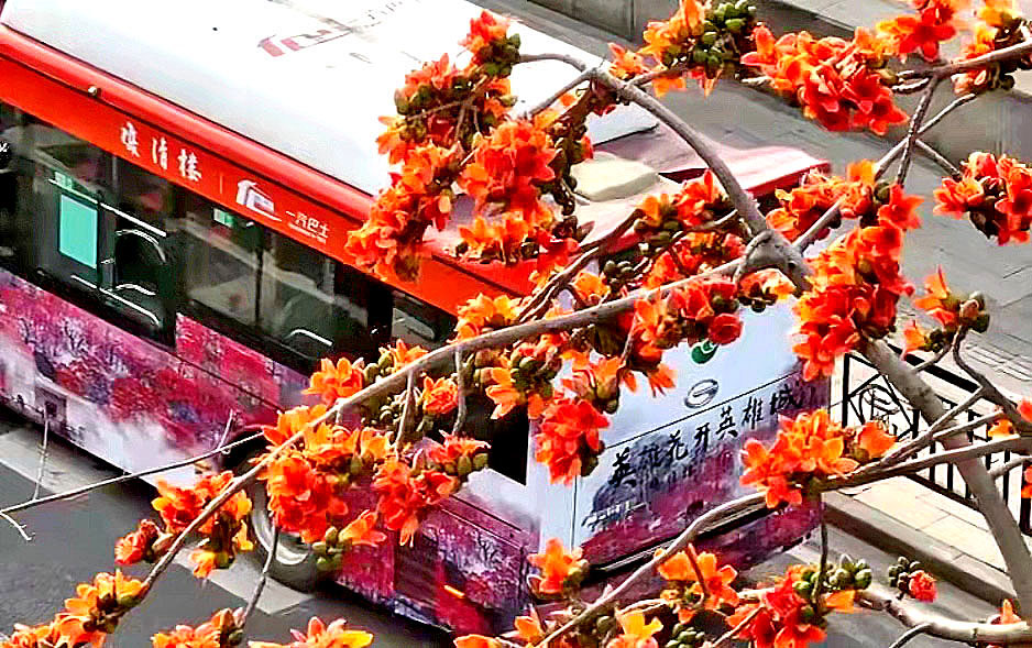 红棉花作为广州市市花,在“老广”心中有着厚重的分量,岭南的春天,满城红棉遍地丹霞,正是广州市民欣赏英雄花的极好时节。此次公司发布的3台“红棉公交”,是中国美协副主席、广东美协主席林蓝和粤港澳大湾区美术家联盟主席汪晓曙联动将艺术融入到城市公共空间——公交车。其中27路“红棉公交”活用了被国家版本馆广州分馆收藏陈列的林蓝老师国画作品《春天》,以金色为底色,浓墨重彩、通过红色颜料层层叠加铺陈出鲜艳蓬勃的木棉花形象,宛如烈火般炽热,又似朝霞般绚丽,象征着铁骨铮铮、一腔热血的英雄精神。“作为一名成长于岭南的文艺工作者,我想借助公交巴士这一与广州百姓生活密切相关的公共交通工具,以具岭南画派风格的国画红棉装饰融合,让特殊的巴士巡游在广州新老城区之间,希望借着红棉的美好寓意把祝福带到城市的每个角落,也希望广州这座英雄之城能守正创新传承弘扬红色文化,续写高质量发展时代新篇章”,林蓝说。