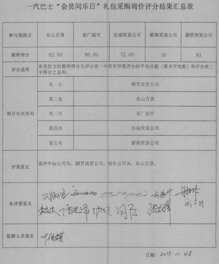 一汽巴士“会员同乐日”礼包采购询价评分结果汇总表