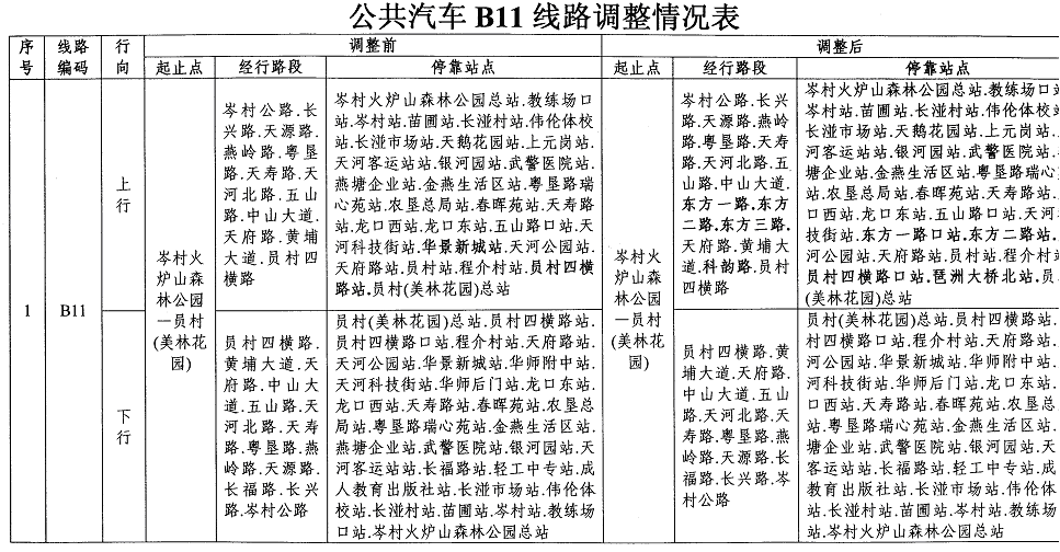 为优先线路,方便市民出行,公司B11路线往员村(美林花园)总站方向,由原经行中山大道、天府路、黄埔大道、员村四横路调整为经行中山大道、东方一路、东方二路、东方三路、天府路、黄埔大道、科韵路、员村四横路,并相应撤销停靠员村四横路站,增加停靠员村四横路口站、琶洲大桥北站。线路起止点、行经路段、停靠站点等具体情况见附件。