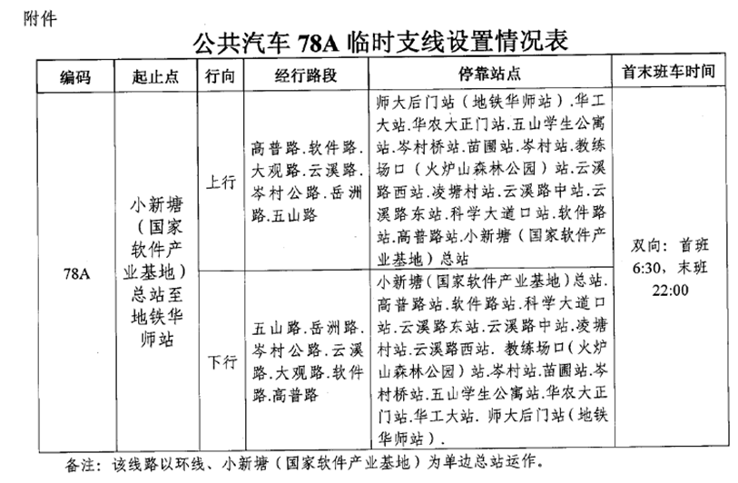 一、开行公共汽车78路线由小新塘(国家软件产业基地)总站至地铁华师站临时支线,线路编码为78A;线路以环线小新塘(国家软件产业基地)单边总站运作,具体经行路段、停靠站点及首末班车时间等设置情况见附件。