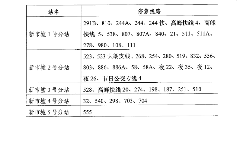 新市墟站(北行)1号分站往南迁移约180米;3号分站往北迁移30米至原4号分站港湾站内;4号分站往北迁移约150米;在齐富路路段增设5号分站。调整后各分站停靠线路安排详见附件。