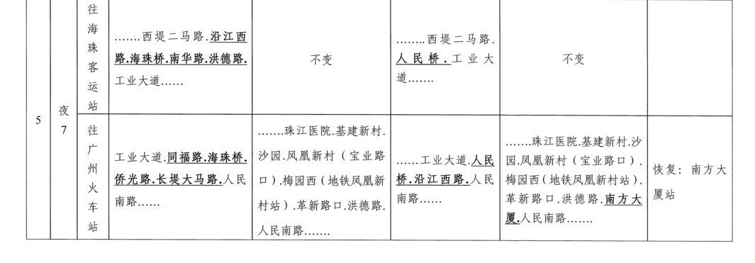 一、公共汽车夜7路恢复通行人民桥,取消绕行海珠桥等路段,具体恢复情况及停靠站点变化情况详见附件。